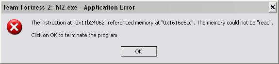 Thankfully this doesn't happen very often but when it does it is annoying. Similarly to J4CK8 it happens when I join cC servers although I usually only play on the fun server. But sometimes I get to the Main Screen and TF2 crashes out, but what happens is that the screen tht was on TF2 stays frozen until I clear the error message (I get the Windows Dong that is played when an error occurs and all sound and video from TF2 stops) and I am forced to press space or enter to clear it. I managed to take a screen shot of the actual error message displayed so here it is. Any help as to what causes this error would be gladly appreciated. Please note that this does not happen very often but has happened about 4 times now, last time was the 11th of August when I took this screen shot.