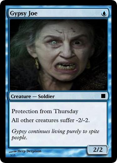 I could totally see my card being all like, "1/1, when another creature comes into play, sacrifice HybridPuppy." You know...if it was ever made. Which it won't.