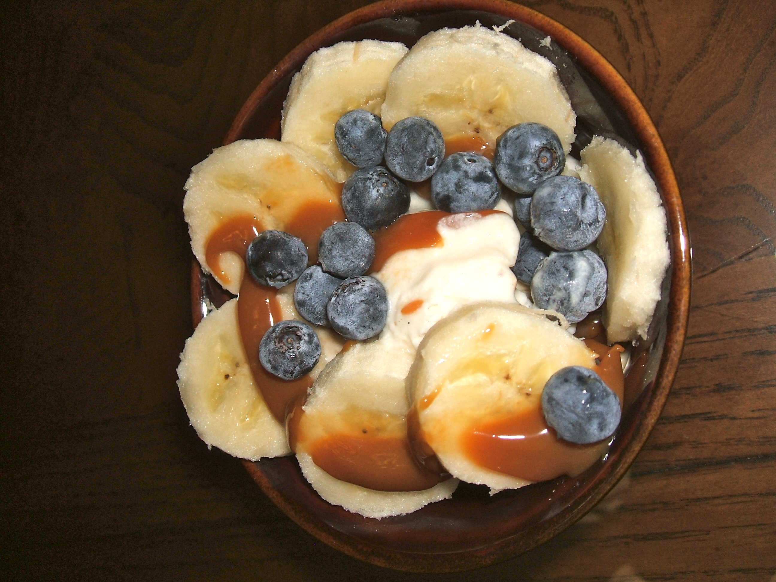aaaand caramel praline ice cream with bananas, blueberries, and dulce de leche :3