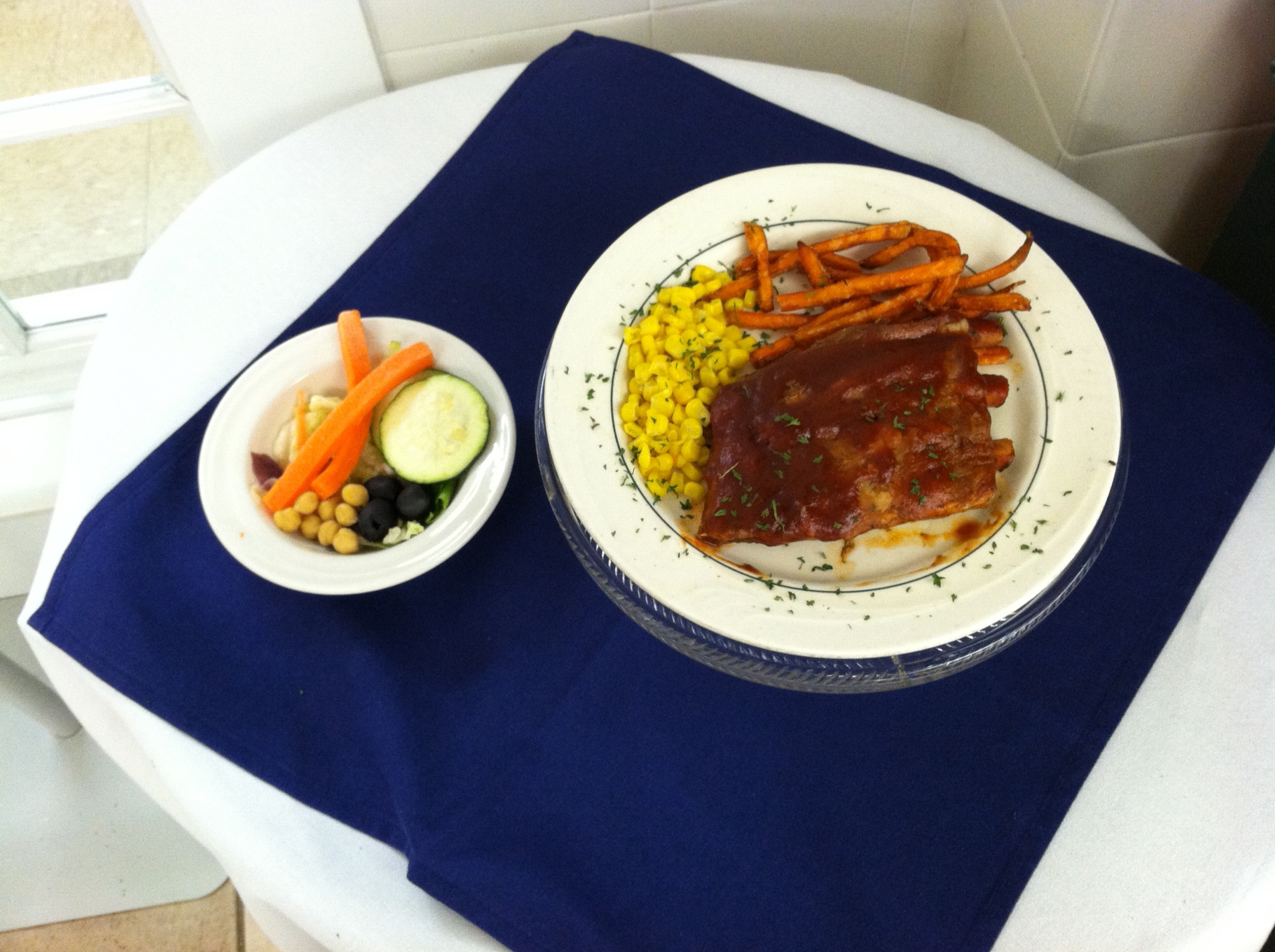 grilled bbq ribs, sweet potato fries, and corn.