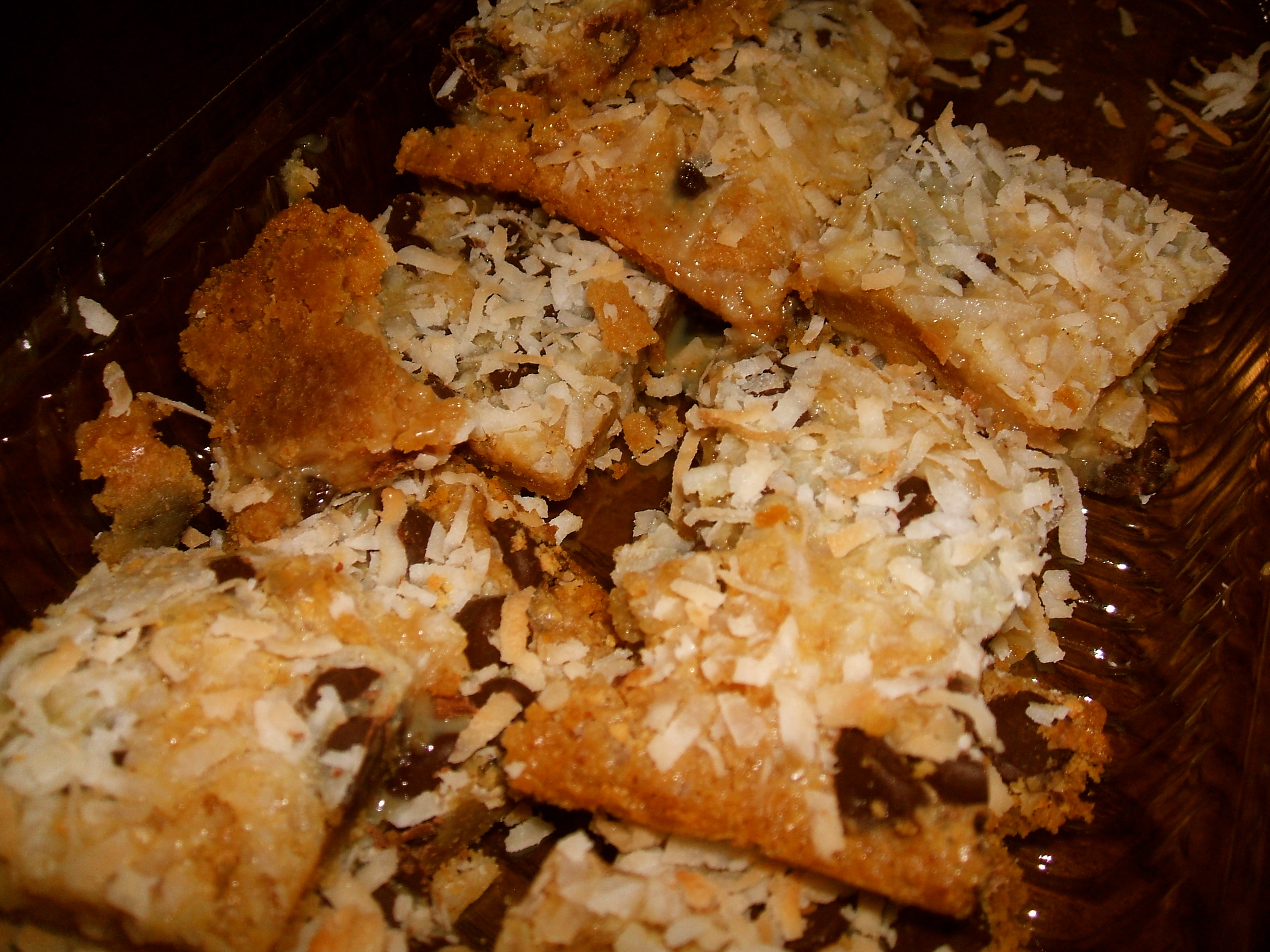 graham cookie base with condense milk, coconut, and chocolate chips. i dunno what to call em but they're damn good.
