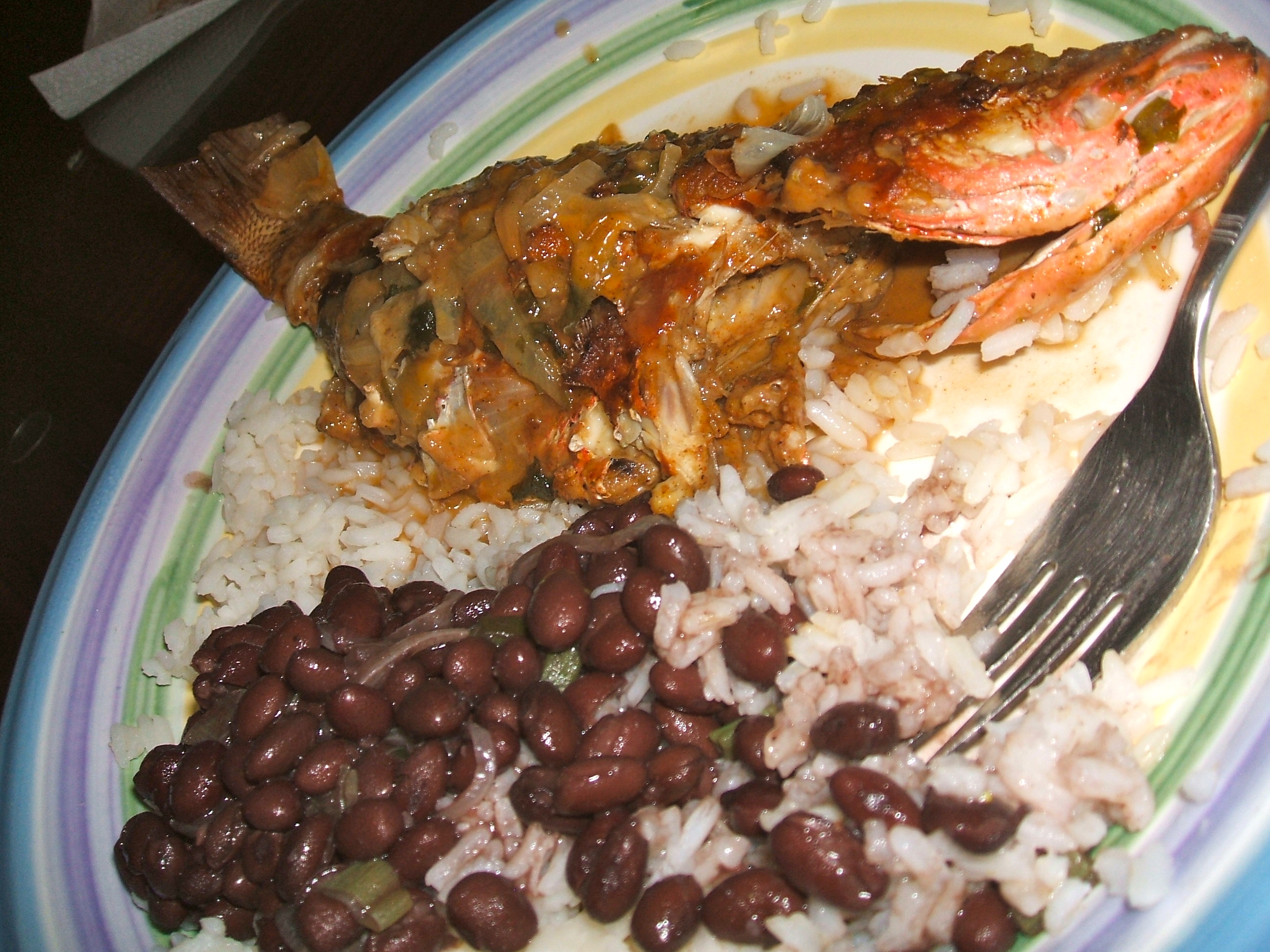 red snapper with black beans and rice.