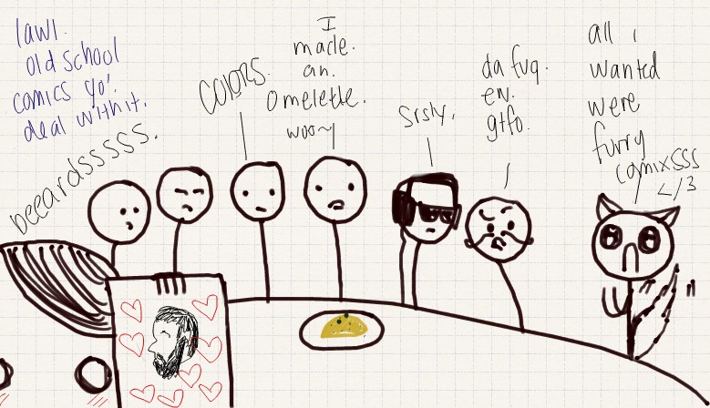 Worth noting that anything I/Wintergreen/Kerplunkers/Phrozen about that old comic being our fursona was said in the most complete and total of ironies. Don't make yourself look like even more of pathetic dork.