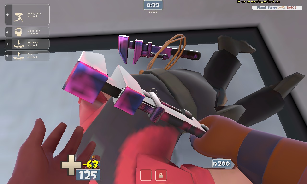 I need the RGB value for that purple that I put on the wrench. By my estimates, that pentagonal piece that constitutes the bottom half of what would go around a bolt on the wrench is at 160-120-255. Can you guys come up with anything better? Reason: a hacky viewmodel might be possible.